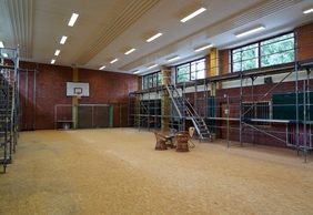 Zuletzt waren die Glasflächen auf der Längsseite der Sporthalle an mehreren Stellen beschädigt. Da dies eine Unfallgefahr für Schüler:innen darstellt, wurde am 23. Juni mit der Sanierung der Glasflächen begonnen. Die alten Fenster wurden demontiert, die Fensteröffnungen verkleinert und neue Fenster inklusive Sonnenschutz montiert. Auch die Eingangstür sowie die Eingangsüberdachung sind erneuert worden. Die Be- und Entlüftung der Sporthalle wurde zudem parallel ertüchtigt bzw. überarbeitet. Die Arbeiten werden zeitnah beendet, die Kosten dafür belaufen sich auf ca. 170.000 Euro.